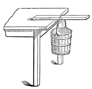 I remember an experiment which puzzled36 me very much when a boy. I read it in a conjuring book, and this was how the problem was put to us: “How,” as the book said, “how to hang a pail of water, by means of a stick, upon the side of a table” (fig. 8). Now, I have here a table, a piece of stick, and a pail, and the proposition is, how can that pail be hung to the edge of this table? It is to be done; and can you at all anticipate what arrangement I shall make to enable me to succeed? Why, this. I take a stick, and put it in the pail between the bottom and the horizontal piece of wood, and thus give it a stiff handle—and there it is; and what37 is more, the more water I put into the pail the better it will hang. It is very true that before I quite succeeded I had the misfortune to push the bottoms of several pails out; but here it is hanging firmly (fig. 9), and you now see how you can hang up the pail in the way which the conjuring books require.