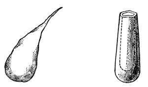 Here is a toy I happened to see the other day, which will, I think, serve to illustrate our subject very well. That toy ought to lie something in this manner (fig. 5); and would do so if it were uniform in substance. But you34 see it does not; it will get up again. And now philosophy comes to our aid; and I am perfectly sure, without looking inside the figure, that there is some arrangement by which the centre of gravity is at the lowest point when the image is standing upright; and we may be certain, when I am tilting it over (see fig. 6), that I am lifting up the centre of gravity (a), and raising it from the earth. All this is effected by putting a piece of lead inside the lower part of the image, and making the base of large curvature; and there you have the whole secret. But what will happen if I try to make the figure stand upon a sharp point? You observe, I must get that point exactly under the centre of gravity, or it will fall over thus [endeavouring unsuccessfully to balance it]; and this you see35 is a difficult matter—I cannot make it stand steadily. But if I embarrass this poor old lady with a world of trouble, and hang this wire with bullets at each end about her neck, it is very evident that, owing to there being those balls of lead hanging down on either side, in addition to the lead inside, I have lowered the centre of gravity, and now she will stand upon this point (fig. 7); and what is more, she proves the truth of our philosophy by standing sideways.