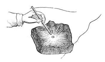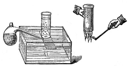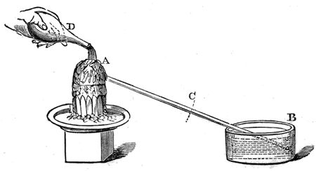 I have spoken of water, and first of all of its property of falling downwards. You know very well how the oceans surround the globe—how they fall round the surface, giving roundness to it, clothing it like a garment; but, besides that, there are other properties of water. Here,23 for instance, is some quick-lime, and if I add some water to it, you will find another power or property in the water.4 It is now very hot, it is steaming up, and I could perhaps light phosphorus or a lucifer match with it. Now, that could not happen without a force in the water to produce the result; but that force is entirely distinct from its power of falling to the earth. Again, here is another substance [some anhydrous sulphate of copper5] which will illustrate another kind of power. [The Lecturer here poured some water over the white sulphate of copper, which immediately became blue, evolving considerable heat at the same time.] Here is the same water, with a substance which heats nearly as much as the lime does; but see how differently. So great indeed is this heat in the case of lime, that it is sufficient sometimes (as you see here) to set wood on fire; and this explains what we have sometimes heard, of barges laden with quick-lime taking fire in the middle of the river, in consequence of this power of heat brought into play by a leakage of the water into the barge. You see how strangely different subjects for our con24sideration arise, when we come to think over these various matters,—the power of heat evolved by acting upon lime with water, and the power which water has of turning this salt of copper from white to blue.