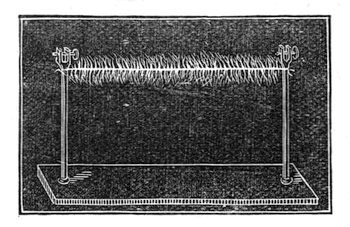 It is my purpose to-day to make you acquainted with some of these powers; not the vital ones, but some of the more elementary, and, what we call, physical powers: and, in the outset, what can I do to bring to your minds a notion of neither more nor less than that which I mean by the word power, or force? Suppose I take this sheet of paper, and place it upright on one edge, resting against a support before me (as the roughest possible illustration of something to be disturbed), and suppose I then pull this piece of string which is attached to it. I pull the paper over. I have therefore brought into use a power of doing so—the power of my hand carried on through this string in a way which is very remarkable when we come to analyse it; and it is by means of these powers conjointly (for there are several powers here employed) that I pull the paper over. Again, if I give it a push upon the other side, I bring into play a power, but a very different exertion of power from the former; or, if I take now this bit of shell-lac [a stick of shell-lac about 12 inches long and 1½ in diameter] and rub it with flannel, and17 hold it an inch or so in front of the upper part of this upright sheet, the paper is immediately moved towards the shell-lac, and by now drawing the latter away, the paper falls over without having been touched by anything. You see—in the first illustration I produced an effect than which nothing could be commoner—I pull it over now, not by means of that string or the pull of my hand, but by some action in the shell-lac. The shell-lac, therefore, has a power wherewith it acts upon the sheet of paper; and as an illustration of the exercise of another kind of power, I might use gunpowder with which to throw it over.