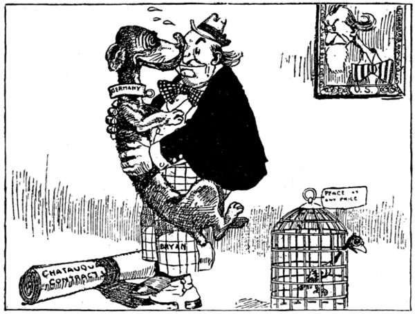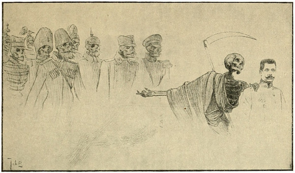 In Holland sind eine große Reihe tüchtiger Karikaturisten an der Arbeit, den Krieg im Bilde festzuhalten. Für den „Amsterdammer“ zeichnet seit 1887 der 1858 geborene Johan Braakensiek wöchentlich etwa zwei Satiren über aktuelle politische Ereignisse, in nicht gerade übermäßig witziger, oft eher hausbackener Art. Im Bestreben, nirgends anzustoßen, bleibt er meist sehr korrekt. Das Beste, was er geschaffen hat, ist der Totenkopf-Schmetterling (Abb. 23) mit der Unterschrift „Geht fort, wir wollen gegen Unbewaffnete nicht kämpfen“. Von ihm rührt auch die in Abb. 1 wiedergegebene Lithographie her, die kurz nach Ausbruch des Krieges erschien; der Tod redet den ermordeten Erzherzog an: „Königliche Hoheit, ich habe geglaubt, eine Fürstlichkeit wie Sie darf nicht ohne Gefolge reisen“ (nämlich nicht ohne Gefolge ins Jenseits, daher im Hintergrunde die Schemen der Gefallenen). Nur einmal hat Braakensiek sein Phlegma verloren, das war nach dem Untergang der Lusitania, auf den später noch besonders eingegangen werden soll.