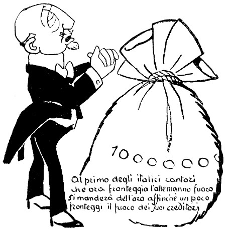 Das bereits erwähnte neue satirische Wochenblatt „Il Numero“ steht, wie schon gesagt, künstlerisch wesentlich höher. Eine ganze Reihe geschickter Zeichner arbeiten dafür. Die Nummern, die zehn Centesimi kosten, haben oft einheitlichen, geschlossenen Inhalt; so wendet sich beispielsweise ein Heft gegen die Schweiz, die angeblich ihre Neutralität in allzu deutschfreundlichem Sinne ausgenutzt hat. Auch der 42 cm-Mörser spielt in diesem Blatte eine große Rolle, wie in der Zeichnung „Der Gleichmacher“ von Nirsoli (Abb. 36). Cadorin zeichnet die kommende Hagia Sofia in Konstantinopel (Abb. 91). Ein anderer Künstler, Scarpelli (scarpe = Schuhe; daher die Signatur links unten) zeigt den deutschen Kaiser, wie er das durch die Neutralität „gefesselte“ Italien mit der Türkei schreckte (Abb. 93). Zu den zahlreichen Blättern gegen den österreichischen Kaiser gehört eine Zeichnung von Nasika „La Bocca del Cattaro“, ein Ausdruck der Freude über die Beschießung dieses süddalmatinischen Hafens durch die französische Marine, die ja übrigens recht trostlos verlief und an jenen berühmten „Sieg“ der Franzosen bei der Beschießung des Leuchtturmes Pelagosa erinnert; damals bestand die Beute aus den Unterhosen des Leuchtturmwächters, zwei alten Hennen, dreißig jungen Hühnern, zwei Tauben, einer Ziege, einem Kanarienvogel und einem halben Hektoliter Wein, die alle von den französischen Matrosen mitgeschleppt wurden. — Daß auch die italienischen Zeitungen den Krieg in Gestalt von Karikaturen verarbeiten, zeigt Abbildung 110; auch in dieser kurz vor Eintritt Italiens in den Krieg erschienenen Zeichnung kommt bereits die deutschfeindliche Tendenz zum beredten Ausdruck.