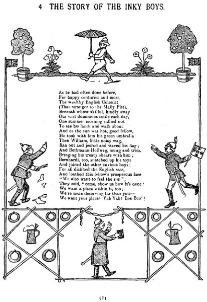 Deutschland ist hier wieder als „Dachshund“ dargestellt. — Ähnliche Absichten verfolgt The Crown Prince’s First Lesson Book or Nursery Rhymes for the Times von George H. Powell mit Randleisten in kräftiger Holzschnittmanier von Scott Calder.