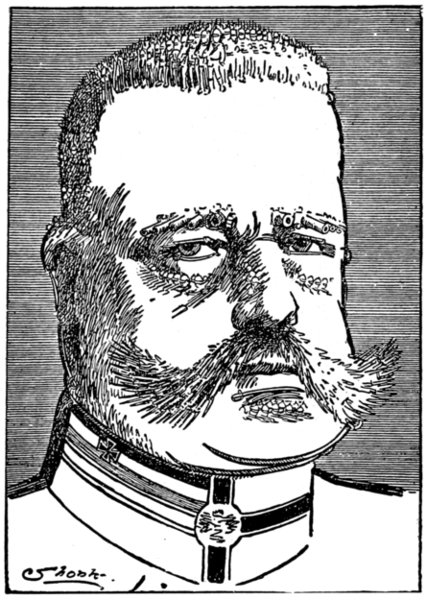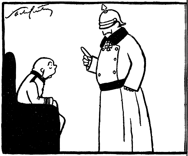 Dem „Kladderadatsch“, der in den annähernd siebenzig Jahren seines Bestehens immer und fast ausschließlich die politische Satire pflegte und über einen ausgezeichneten Stab von Mitarbeitern, vor allem auch unter seinen Zeichnern, verfügt, war es nicht schwer, der begeisterten Erhebung der Deutschen Ausdruck in Wort und Bild zu verleihen. Von Gustav Brandt, dem Schüler der Düsseldorfer und Berliner Akademie, rührt seit Jahrzehnten das künstlerisch Feinste und Wichtigste her, das der „Kladderadatsch“ gebracht hat. Weltbekannt sind seine Porträts berühmter Zeitgenossen, denen er jetzt unter anderm das Bildnis des eigentlichen Urhebers des ganzen Krieges hinzugefügt hat (Abb. 4). „Wie dem Kothurnschritt der alten Tragödie das leichte Satyrspiel folgte, so hat der Ernst der Geschichte, so hat der Ernst des Lebens immer den Humor und den Witz zur Seite gehabt, denn nur durch diese Begleitschaft wird der Ernst des Lebens uns erträglich gemacht. Es ist dies die idealere Seite unserer Witzblätter, wenn sie ihre Aufgabe richtig verstehen,“ schrieb er beim Erscheinen der ersten Kriegsnummer. Aber auch die andern deutschen Witzblätter, und selbst solche, die vorwiegend die gesellschaftliche Satire behandeln, nahmen rasch eine Neuordnung vor. Die Themen, die noch im Juli 1914 die Hauptsache bildeten, versanken vor größeren Aufgaben. Die Klänge des Two-Steps übertönte das Summen der 42er Brummer, und der Tango ging in den masurischen Sümpfen mit unter.