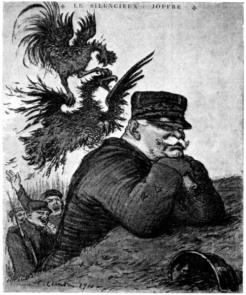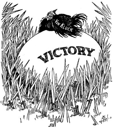 Eine sehr umfangreiche Sammlung von Karikaturen aus der Zeit des siebziger Krieges besitzt die Berliner Königliche Bibliothek, die auch diesmal neben anderen Instituten und zahlreichen Privaten die Veröffentlichungen über den Weltkrieg eifrig sammelt. Durchaus nicht alles, was erscheint, ist literarisch und künstlerisch bedeutsam, aber echte Sammler heben diese Dinge auf, auch das Kleinste und Unscheinbarste, als vergängliche Zeugnisse einer ungeheuer großen Zeit, mit der ein neuer Abschnitt der Weltgeschichte beginnt.
