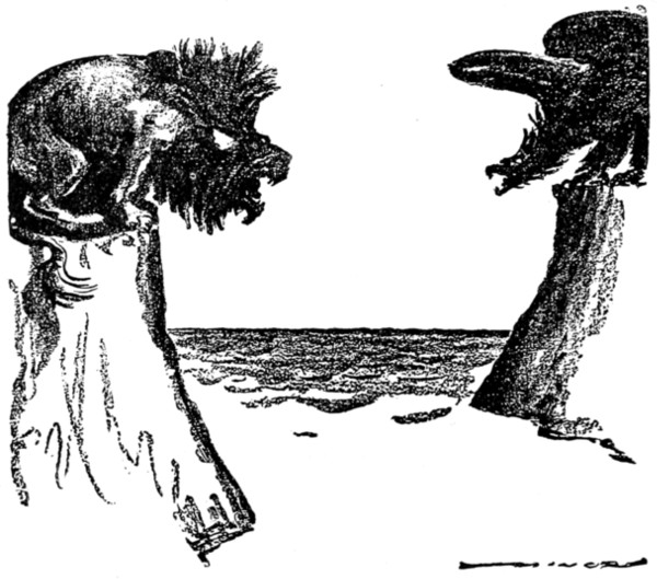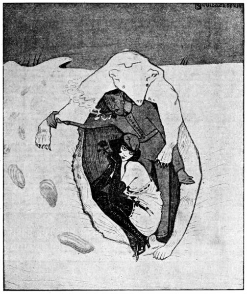 Glücklicherweise gibt es aber auch in Deutschland Karikaturisten, die sich mit den allerbesten anderer Länder messen können. An erster Stelle steht wieder mit Leistungen, die auch künstlerisch voll befriedigen, der „Simplicissimus“, und hier besonders der Skandinavier Olaf Gulbransson, der ja seit langen Jahren ganz zu uns Deutschen gehört. Neben seinem engeren Kollegen Th. Th. Heine und neben G. Brandt und A. Johnson vom „Kladderadatsch“ marschiert er an der Spitze der zeitgenössischen deutschen Karikaturenzeichner. Wollte man ihm gerecht werden, so müßte man schlechtweg seine sämtlichen Arbeiten im „Simplicissimus“ nennen, denn gelungen sind sie alle. Wie glänzend weiß er seine Helden zu charakterisieren, ohne durch gewaltsame Verzerrung Grotesken zu schaffen! In seiner Hand ist die Karikatur nicht nur im etymologischen Sinne des Wortes „Übertreibung“, hier wird sie zu einer großartigen politischen Satire. Man betrachte seine beiden Zeichnungen gegen die Japaner (Abb. 8 u. 9). Ist hier nicht restlos die Stimmung wiedergegeben, die alle Kreise unseres Landes gegen das Volk erfaßte, das Kiautschou raubte? Auch andere Zeichner haben (es war ja sehr billig) die Japse als Affen dargestellt, in allen Zeichnungen traten sie als Vierhänder auf, aber niemandem ist das mit solch raffinierter Beschränkung in den künstlerischen Mitteln gelungen wie Gulbransson. Durch den Nachsatz „Auf den Protest beleidigter Schimpansen kann keine Rücksicht genommen werden!“ erhält das Bild erst die richtige Wucht: also noch unter die Affen werden die Japaner gestellt! Wie köstlich ist der beleidigte Schimpanse! Der Künstler drückt damit denselben Gedanken aus, den die „Jugend“ in die Worte kleidete: „Die Japaner haben den Augenblick, da Deutschland mit vier Staaten zugleich Krieg führt, dazu benutzt, ihm Kiautschou zu stehlen. Damit sind sie vom Niveau anständiger Makaken auf die Stufe von Engländern herabgesunken!“ Aber nicht bloß als Quadrumanen zeigt uns Gulbransson die Japaner; er ist auch der einzige, der noch eine andere Lösung fand, dem Haß gegen den englischen Helfershelfer bildlichen Ausdruck zu geben: in der Zeichnung „Die Wacht in Kiautschou“, wo die Mongolen den wie ein einsamer Fels stehenden deutschen Ritter als unzählige Wellenköpfe umbranden, um schließlich, allein durch ihre Masse, über ihn zu triumphieren. Reine Freude gewährt auch seine „Alpenwacht“ in der Italiennummer, wo auf gelbem Hintergrunde sich der deutsche Reichsaar und der österreichische Doppeladler mit kraftvollem Schwarz massig und gewaltig abheben, während in der Ferne das Diminutivum eines Italieners erscheint, nur aus einem großen Maule bestehend: „Und der will uns etwas anhaben, der ist ja nur auf Singvögel eingeschossen.“ Mit einfachen Mitteln ist hier eine große Wirkung erreicht. Dieses Blatt ist durch die flächige Behandlung auch dekorativ sehr wirkungsvoll. Ausgezeichnet sind ferner die Beiträge von Ragnvald Blix im „Simplicissimus“. Neben dem Schweden Gulbransson ist dieser Norweger eine der größten Begabungen, die in Deutschland arbeiten. Seine reiche Phantasie weiß die Persönlichkeiten, die er sich vornimmt, außerordentlich witzig zu charakterisieren. Hier braucht nur an seine famose Karikatur „An der Ostfront“ erinnert zu werden: „Ganghofer ist da — der Sturm kann beginnen.“ Nur wenige wissen, daß Blix noch vor einigen Jahren viel für französische Zeitungen, unter anderen auch für „Le Rire“ und „Le Journal“ gezeichnet hat. Er wurde bekannt durch eine Serie Karikaturen auf klassische Gemälde, die zuerst als Sammlung „Le voile tombe“ 1908 herauskam und auch deutsch im gleichen Jahre unter dem Titel „Nach alten Meistern“ erschien.