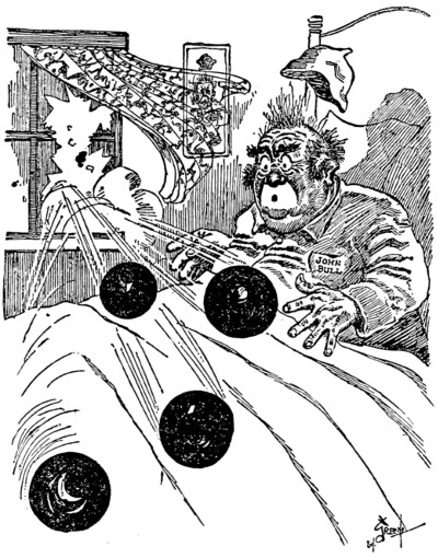 Satire auf die Furcht der Engländer vor den Zeppelinen. (Punch, London.)