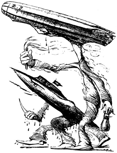 Selbst deutsche Witzblätter, die sich sonst von der Politik vollständig fernhielten, haben sich den veränderten Verhältnissen fügen müssen und bringen nun auch Kriegswitze und Kriegskarikaturen. In den „Meggendorfer Blättern“ finden sich recht hübsche Illustrationen von tüchtigen Zeichnern. In den „Fliegenden Blättern“ ist ebenfalls der sonst den Schwiegermüttern, zerstreuten Professoren, Dackeln und stehengebliebenen Regenschirmen geweihte Raum teilweise mit netten, stubenreinen Witzen, die sich in irgendeiner Weise mit dem Weltkrieg beschäftigen, angefüllt.