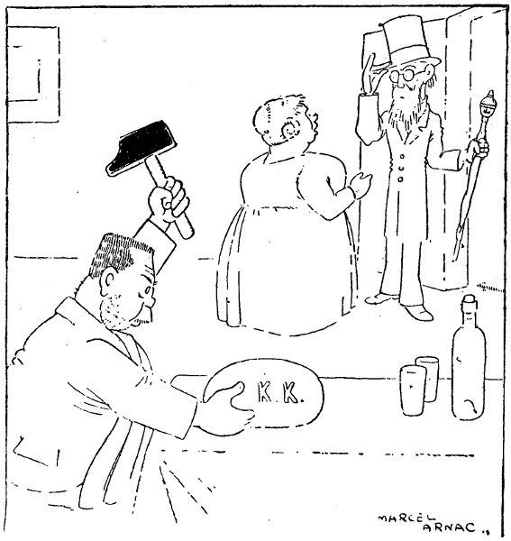 Ein anderes sehr beliebtes Thema ist das deutsche K-Brot, das sich die Franzosen als ein Brechmittel schlimmster Art vorzustellen scheinen (Abb. 87). Métivet zeichnet ein Bild „Boulangerie allemande“ mit der Unterschrift: „Après le pain K, le pain KK. Ça ne sent pas bon un K, deux K, trois K! Cette histoire-là finira par vingt Q.“ (Wortspiel für vaincu = besiegt). Ein anderes Bild von Maxa zeigt einen Offizier im Gespräch mit einem Kinde. „— M’sieur, J’veux faire du pain pour vos soldats! —“ ...??? — „ ... KK!“ — Am besten ist noch die große farbige Zeichnung von Abel Faivre „La grande vie à Berlin.“ In einem eleganten Lokale sitzt ein Deutscher, sehr nachlässig gekleidet, wie ihn sich der Franzose vorstellt; der Primgeiger tritt an den Tisch und fragt: „Quelle morceau, M’sieur, préfère-t-il?“ Die Antwort lautet: „Un morceau de pain.“