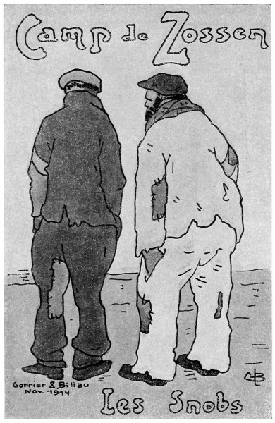 Unter den Zossener Gefangenen sind auch eine Anzahl Künstler und Lehrer, die sich ihre freie Zeit durch Anfertigung von scherzhaften Originalaquarellen vertreiben, die von guter Begabung zeugen und denen infolgedessen auch ein künstlerischer Wert nicht abzusprechen ist. Zwei dieser farbigen Originale auf Postkarten sind hier in schwarzer Reproduktion abgebildet (Abb. 89 und 90), Spottblätter auf die mitgefangenen „Verbündeten“. Andere Karten zeigen zum Teil in sehr derber Darstellung, „Les Aborts“, „Toilette intime“, „A la Queue“ (das Essenfassen; hier hat der Künstler, um die Eßmarke im Original auf der Karte verwenden zu können, sogar auf die eigene Ration verzichten müssen).