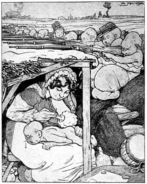 Wicked Willie von Margaret A. Rawlins mit Illustrationen von Gwen Forwood und Florence Holmes geht nicht nur unter der Marke einer Jugendschrift, sondern ist wirklich ein Buch für Kinder und hält sich daher auch von allem fern, was für Kinderaugen nicht bestimmt ist. Der Verfasserin schwebte das 1871 erschienene „Dame Europa’s School“ vor, an das sie sich nach dem Grundsatze Imitation is the sincerest flattery anlehnt; auch die „Dame Europa“ war eine Geschichte des deutsch-französischen Krieges für englische Kinder (das sehr selten gewordene Buch ist übrigens jetzt nach 44 Jahren neu aufgelegt worden). Der Wicked Willie soll den Weltkrieg (selbstverständlich vom englischen Standpunkte aus) den Kleinen verständlich machen; die Nationen treten hier als Kinder (Wicked Willie, Poor Joseph, Fezzie [Türkei], Little Albert, Little Helvetia usw.) handelnd auf. „Einst war“, so beginnt der hübsch gedruckte Quartband, „Tante Europas Schule nicht größer als andere Schulen auch; die meisten Kinder waren unwissende, gutmütige kleine Dinger, sie standen herum, die Finger im Munde, und gehorchten den Anordnungen der wenigen, die größer und klüger waren. Natürlich konnten sie, wie das bei Kindern nun mal so ist, nicht immer friedlich miteinander spielen ..., aber erst, als die Schule immer ausgedehnter und bedeutender wurde, da begann der große Streit, der jetzt noch anhält ...“ — Für Erwachsene bestimmt sind trotz des Titels die Nursery Rhymes for Fighting Times von Elphinstone Thorpe, illustriert von Stevens. An der Hand altberühmter englischer Reime, wie sie Mütter und Erzieherinnen den Kindern vorsagen, werden hier die politischen Ereignisse satirisch behandelt: