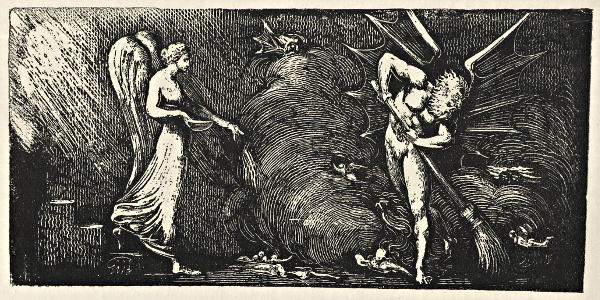 Blake was profoundly influenced by his residence at Felpham in one respect; he became acquainted with opposition, and distinctly realised a power antagonistic to his aspirations. He was thus stung into self-assertion, and became hostile to the artists whose aims and methods he was unable to reconcile with his ideas. The first hints of this attitude appear in the praises he bestows upon the work of his own which chiefly occupied him at Felpham, the Jerusalem. “I may praise it,” he says, “since I dare not pretend to be any other than the secretary; the authors are in eternity. I consider it as the grandest poem that this world contains. Allegory addressed to the intellectual powers, while it is altogether hidden from the corporeal understanding, is my definition of the most sublime poetry.” Blake’s allegory so effectually eludes both the reason and the understanding that Messrs. Ellis and Yeats frankly tell us that it is not for a moment to be supposed that their own elaborate interpretation will convey any idea to the mind unless it is read conjointly with the poem; and if such is the commentary what must the text be? If they are right the confusion is greatly increased by a wrong arrangement, and by the numerous interpolations which Blake subsequently introduced into the poem, which, though nominally issued in 1804, was not, they think, actually completed until about 1820. It suffers from being nearer prose than any of his former books. “When this verse was dictated to me,” he says, “I considered a monotonous cadence, like that used by Milton, Shakespeare, and all writers of English blank verse, derived from the modern bondage of rhyming, to be a necessary and indispensable part of the verse. But I soon found that in the mouth of a true orator such monotony was not only awkward, but as much a bondage as rhyme itself.” What can be said of the ears that could find Shakespeare’s and Milton’s blank verse monotonous? The truth is that Blake’s originally exquisite perception of harmony had waned with his lyrical faculty, and he scoffs at what he is no longer able to produce. Yet the general grandiose effect of Jerusalem is undeniable. Little as we can attach any definite idea to it, it simultaneously awes and soothes like one of the great inarticulate voices of nature, the booming of the billows, or[46] the whisper of the winds in the wood. Occasionally we encounter some beautiful little vignette like this:—