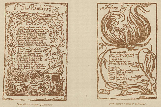 An evident, though probably unconscious, reminiscence of “When the morning stars sang together, and all the sons of God shouted for joy,” and like it for that extreme closeness to the inmost essence of things which the author of the Book of Job enjoyed in virtue of the primitive simplicity of his age and environment, and Blake through a childlike temperament little short of preternatural in an age like ours. It may be added, that although the pieces in Songs of Innocence and Songs of Experience are of very unequal degrees of poetical merit, none want the infallible mark of inspired poetry—spontaneous, inimitable melody.