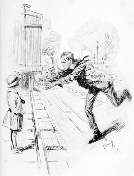 So they went on, past sidings laden with long[15] lines of freight cars, past locomotives sizzling idly, past a crossing where eight burnished rails, aglow in the sunlight, crossed their path, under a big signal tower, their eyes very busy and their stomachs, since they had not eaten since early the preceding afternoon, very empty. A long freight shed was reached, and as they passed it one of the many doors slid slowly open and a brawny man stood revealed against the dimness beyond. He stretched his arms, yawned, caught sight of the passers and stood there, framed in the square opening, staring interestedly. Wayne stopped.