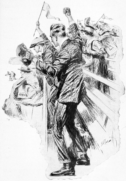 June, however, had no chance to give Mr. Milburn’s message to Wayne, for Wayne did not come around to the hotel and June’s duties prevented him from seeking him at noon hour. June got his dinners at the hotel, which meant a saving of thirty cents a day, but he wasn’t allowed much time to eat them in. Consequently it was with the intention of walking boldly past Mike, the gate-man, that Wayne started out for the field that afternoon. Yesterday’s close contest, and the fact that today’s encounter was the last with the Damascus club at Harrisville until after the home team’s swing around the circle which began next week, had combined to awaken a more than usual amount of interest in the afternoon’s game and the cars that buzzed and clanged their way past Wayne were filled to the running-boards. It was evident that the attendance at the park today would assume holiday proportions, and, too, that the railway company had, in spite of extra cars, failed to accommodate all who wanted to ride. Wayne had started early, hoping to get there about the time the players went in and trusting to the good offices of “Red” Herring or some other acquaintance to gain him admittance should Mike prove obdurate, but the players had passed him[285] long ago in their car and it lacked but twenty minutes of starting time when he got within distant sight of the park.