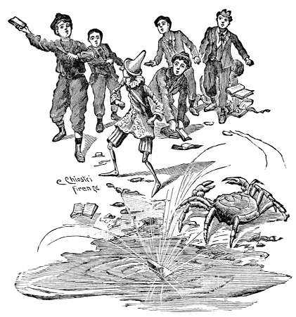 Girò gli occhi smarriti intorno alla stanza per vedere di dove mai poteva essere uscita quella vocina, e non vide nessuno! Guardò sotto il banco, e nessuno: guardò dentro un armadio che stava sempre chiuso, e nessuno; guardò nel corbello dei trucioli e della segatura, e nessuno; aprì l'uscio di bottega per dare un'occhiata anche sulla strada, e nessuno. O dunque?...