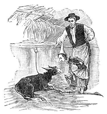 Appena che Pinocchio fu entrato nella stalla; vide un bel ciuchino disteso sulla paglia, rifinito dalla fame e dal troppo lavoro. Quando l'ebbe guardato fisso fisso, disse dentro di sè, turbandosi: