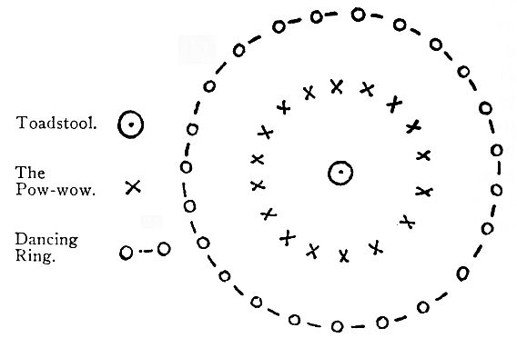 When they come together they plant the toadstool in the center and the Brownie captain (that is, the leader of the Pack) takes her place by the toadstool. The Brownies then form a ring around her, the Elves together (there must not be more than eight of them), the Goblins together, the Fairies together, and so on.