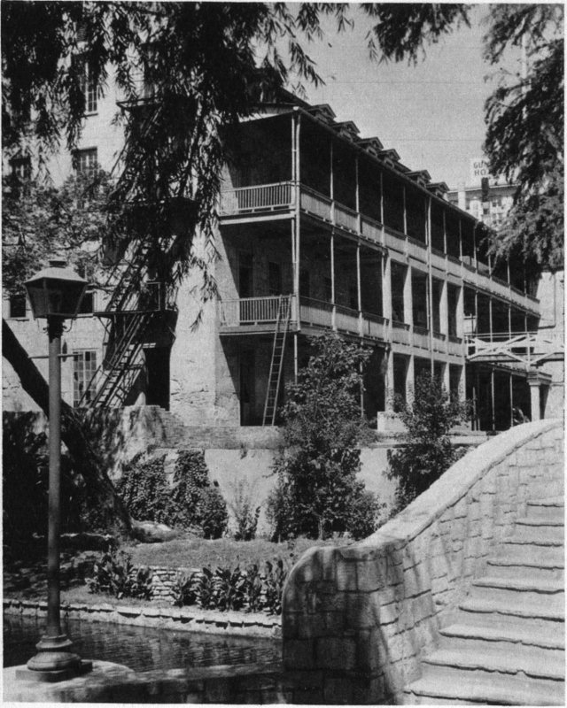 One of the several boat landings along the San Antonio River. Many of the buildings bordering the river have overhanging balconies and a few street level business houses can be reached from river bank entrances.