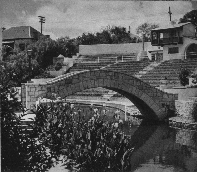 The San Antonio River which finds its source in numerous flowing springs just north of Brackenridge Park and winds its way through the business section of the city, has been transformed into a beautiful Venetian canal with walkways below the street level along banks lined with semi-tropical flowers and shrubs.