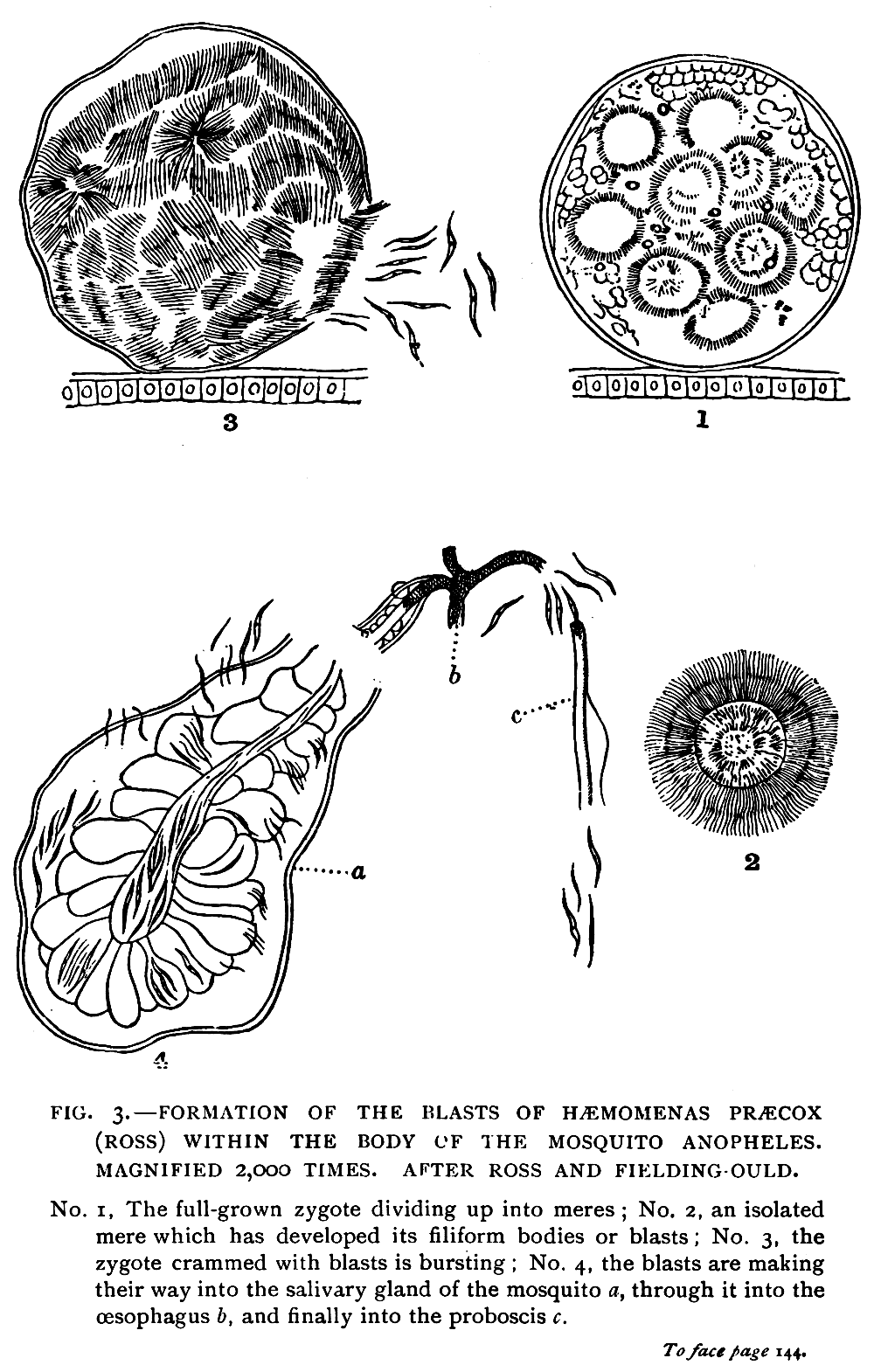 | FIG. 3.—FORMATION OF THE BLASTS OF HÆMOMENAS PRÆCOX (ROSS) WITHIN THE BODY OF THE MOSQUITO ANOPHELES. MAGNIFIED 2,000 TIMES. AFTER ROSS AND FIELDING-OULD | 144 |