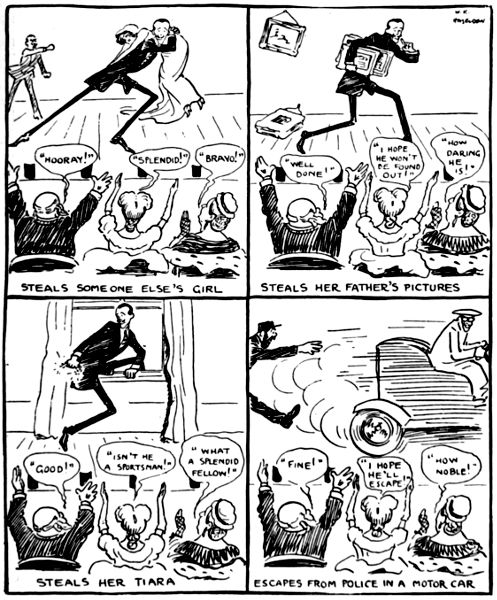 The Bohemian of the twentieth century is a much more wholesome person than his prototype of the middle of the nineteenth. He may be still as irresponsible, as unconventional in his manners, but he is at least clean and less apt to degenerate into the “sponger.” He of the older generation provided picturesque material for the humorist of[ii] the pencil; but the stage, the study, and the studio still furnish much matter for mirth, as the admirable work of Mr. W. K. Haselden, Mr. Bert Thomas, Mr. H. M. Bateman, Mr. J. L. C. Booth, Mr. Charles Pears, and other living artists of note, represented in the present collection, bear ample witness.