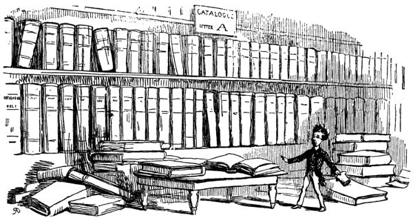 Books in toy basket: amongst others THEOLOGY, SHAKESPEARE, EUCLID, BOYLE, BENTLEY, MILTON, HUME