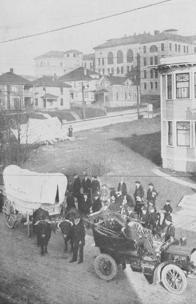 It would appear unseemly for the writer, as a guest, to criticize his host, the Commercial Club, for the manner of his entertainment, particularly considering the cordiality of the invitation. "We hope that you can be here, but if you cannot there will be at least one vacant chair at the banquet table, and it will be held in memory of Ezra Meeker, the pioneer of the Puget Sound country", this following expressions of concern as to my health. So, whatever criticism may follow will be as a friend of a friend and not in a facetious spirit. Let us now consider the banquet, so intimately connected with the subject of the high cost of living, or perhaps in this case might I not better say, "cost of high living", or for what might be more appropriately known as the woeful waste cost of living. Covers were laid for 344 in the large banquet hall, and every seat was occupied. In addition a large number were fed in overflow, improvised dining halls, the participants coming into the main hall to hear the speeches after the feast was over. Seven courses came upon the board, including wine in profusion. Fully one-third of the viands of these seven courses was sent off the table and to the garbage cans, destined to soon reach the incinerator or sewers of the city, and later the deep sea waters of Puget Sound, save one item, the wine, all of which was consumed. As I sat and mused, to me it seemed a pity the wine did not follow the waste into the sea. The tables and hall were profusely decorated with flowers. In one corner of the hall soft strains of sweet music would issue from a band half hidden from view. Alternately with these, in a more central position, gifted singers would entertain the assemblage with appropriate songs.