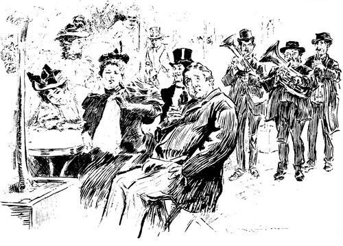 But the climax of the night was reached last year when the band of a hundred pieces struck buoyantly into that most reckless and impudent of marches and comic songs, "The Man that Broke the Bank at Monte Carlo." The cymbals clashed, and the big drums emphasized the high notes, and the brass blared out boastfully with a confidence and swagger that showed how sure the musicians were of pleasing that particular audience with that particular tune. And they were not disappointed. The three thousand men and women hailed the first bars of the song with a yell of recognition, and then dancing and strutting to the rhythm of the tune, and singing and shouting it in French and English, they raised their voices in such a chorus that they could be heard defiantly proclaiming who they were and what they had done as far as the boulevards. And when they reached the high note in the chorus, the musicians, carried away by the fever of the crowd, jumped upon the chairs, and held their instruments as high above their heads as they could without losing control of that note, and every one stood on tiptoe, and many on one [Pg 153] foot, all holding on to that highest note as long as their breath lasted. It was a triumphant, reckless yell of defiance and delight; it was the war-cry of that class of Parisians of which one always reads and which one sees so seldom, which comes to the surface only at unusual intervals, and which, when it does appear, lives up to its reputation, and does not disappoint you.