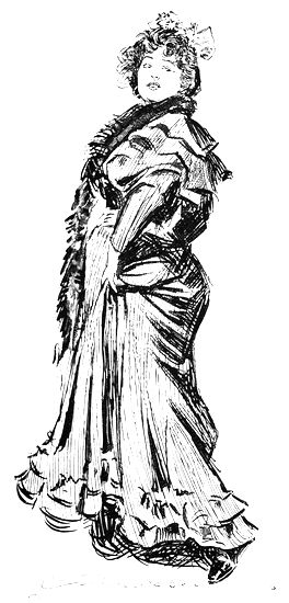 Two gendarmes, with their capes folded and thrown over their shoulders, come in and stand with the waiters, surveying the rehearsal with critical disapproval, and the woman who collects the pennies for the iron seats in the avenue takes a few moments' recess, and brings with her two nurse-maids, with their neglected charges swinging by the silken straps around their silken bodies. And so they all stand at one side and gaze with large eyes at the breathless, laughing young woman on the stage above them, who runs and kicks and runs back and kicks again, reflected many times in the background of mirrors around her; and then the two American song-and-dance men, and the English acrobats, and the Italian who owns the performing dogs, and the smooth-faced French comédiennes, and all the idle gentlemen with glasses of bock before them, sit up as though some one had touched their shoulders with a whip, and all the actresses smile politely, and look with pressed lips and half-closed eyes at a very tall woman with red hair, who walks erectly down the stage with a roll of music in her gloved hands. This is Yvette Guilbert, the most artistic and the most improper of all the women of the cafés chantants. She is also the most [Pg 40] graceful. You can see that even now when she is off her guard. She could not make an ungraceful gesture even after long practice, and when she shudders and jumps at a false note from the orchestra she is still graceful.