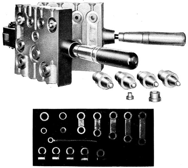 The top connectors most frequently replaced are the taper end connections 12and end connections with wire cable leads. For battery men desiring these parts, but not the large combination link mould, the AMBU-Washburn terminal mould, Figure 9, has been designed. It has the same general good features of the larger mould, and casts four end connectors, one wire cable leed and two washers.