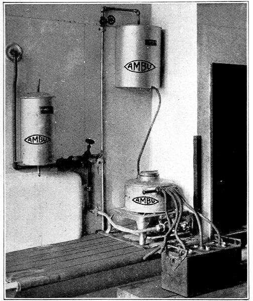 AMBU CONDENSER FOR DISTILLING WATER, accompanies either type Steamer, if desired. When Steamer is not being used for steaming batteries, and when used in conjunction with this Condenser, will produce about one gallon of distilled water per hour at very small cost.