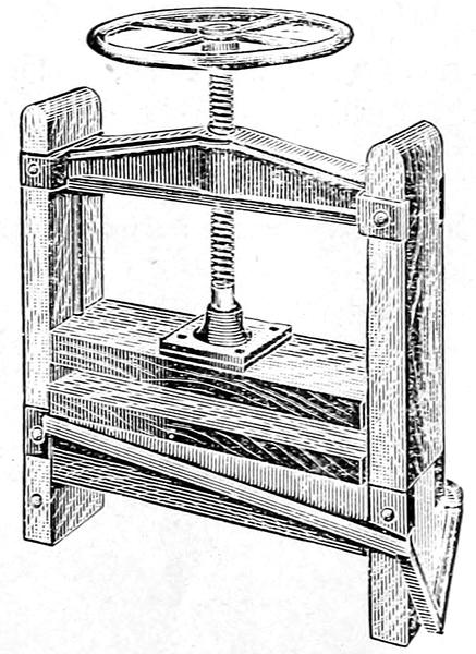 The Ambu Battery Plate Press is made of heavy hardwood timber with two horizontal wooden jaws between which the battery plates are pressed. A set of lead covered troughs carries away the acid. The upper jaw of the press is attached to a screw shaft for raising or lowering it. A complete set of transite boards for placing between the plates, and a substantial wall support are included in the purchase price. Press complete, including set of press separator boards sufficient to press three groups, and substantial wall support. Price on request.