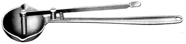 The only other equipment necessary to handle the melted lead is a ladle. For this purpose a malleable iron melting ladle five inches in diameter should be purchased. It can be used for stirring, skimming and pouring, and the type with a spout, illustrated in Fig. 5 will be found most suitable. The ladle should be cleaned and treated exactly like the melting pot.