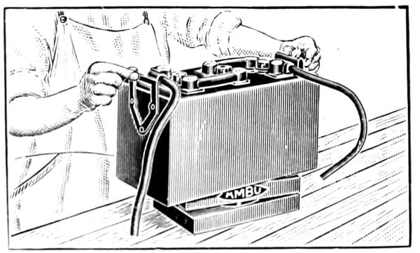 Every battery that has to be opened must have the top connectors drilled off as in Fig. 1, which naturally makes a lot of lead chips. These drillings have to be cleaned off before proceeding with the repair and can, with no loss of time, all be collected, as in Fig. 2, and saved. Then the old sulphated end connectors and parts from “junked” batteries accumulate very fast.