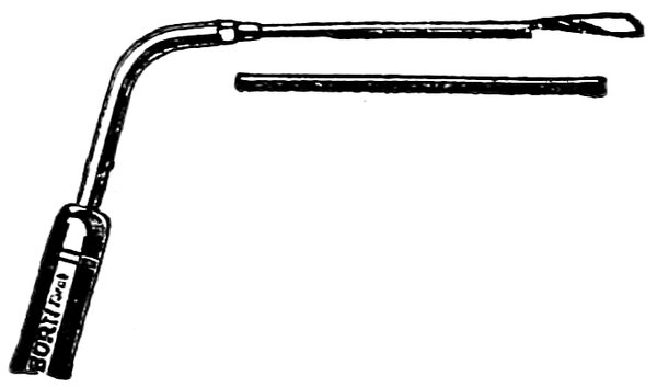 This torch produces a soft pointed flame. Especially adapted for all torch uses in repairing of storage batteries. Can be nosed into post builder; stirring molten lead with nose of torch without popping out. Not affected by wind. Burns clean, requiring heat up to 5300 degrees Fahrenheit.