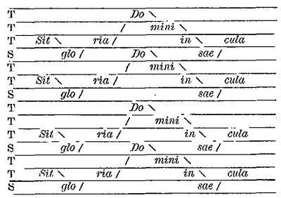 Early in the tenth century a monk in Flanders named Hucbaldus introduced a stave, as we call it, consisting of a great number of lines. At first these lines were not occupied by notes, but by the syllables to be sung, as shown in Fig. 4. In order to show whether the voice was to proceed by a tone or a semi-tone, the letters T and S were introduced. One advantage attending this system was that it could be applied to a scale of any extent, and even used for a number of voices singing at the same time.