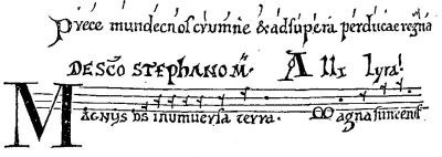 In the Bodleian Library at Oxford, England, is a very precious old book, once used in the cathedral at Winchester. It is MS., of course, and is believed to have been written during the reign of King Ethelred II., who died in 1016. In it we find music written in two different fashions, as shown in Fig. 5. This, then, was the period of change. We have the simple neumæ above the words, and we have actually a four-line stave with notes instead of words.
