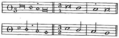 But up to this time all the notes were the same; no difference in length was indicated, and no one who had not heard the melody could sing it from them. Presently the breve, semibreve, and dot, as shown in Fig. 6, began to appear, and thus, little by little, our own system of notation was approached. In 1600 an Italian named Franco de Colonia established a system of time, and in or about 1600 the first idea of a score originated.