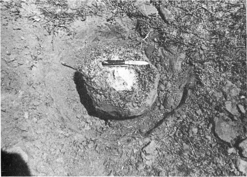 The Furnas County, Nebraska, stony meteorite in place at the bottom of its 10-foot “penetration funnel.”