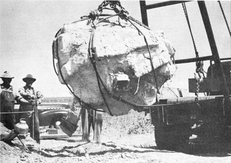 The excavated meteorite looked and felt like a huge stone. Actually, it was stony in nature, but of a texture so fragile that it had to be wrapped in tissue paper, then in burlap, and finally covered with a thick coating of plaster of Paris before it could be lifted out of the ground. Those in charge of the removal of the meteorite borrowed this procedure from the paleontologists, who use it in the removal of fossil tusks and bones that otherwise would crumble away.