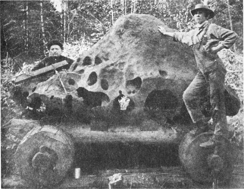 COURTESY OF E. L. KRINOV A nickel-iron meteorite from the Ussuri fall imbedded in the trunk of a cedar tree.