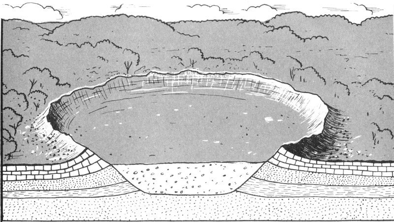 The first thing to be said on this subject is, of course, that not all holes in the ground, however large and impressive, were necessarily formed by the impact of meteorites. Features that resemble meteorite craters may result from certain ordinary earth-processes. For example, the rock layers underlying a particular area may be dissolved away by waters circulating beneath the surface of the ground. The overlying crust will eventually collapse into the empty space, and what geologists call a “sink hole” or a “sink” is formed. Many such sinks surround the genuine meteorite crater near Odessa, Texas, and at times have been mistaken for the real thing.