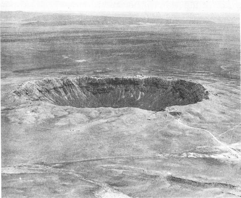 On the other hand, meteorite impact craters are not formed 43 by earth-processes at all. As we have seen, they result when large bodies of matter from the regions of space outside the earth chance to strike the surface of our planet at high speed. The study of meteorite craters is therefore a special field. It is also one of quite recent development; not until 1905 was the first meteorite crater recognized as such.