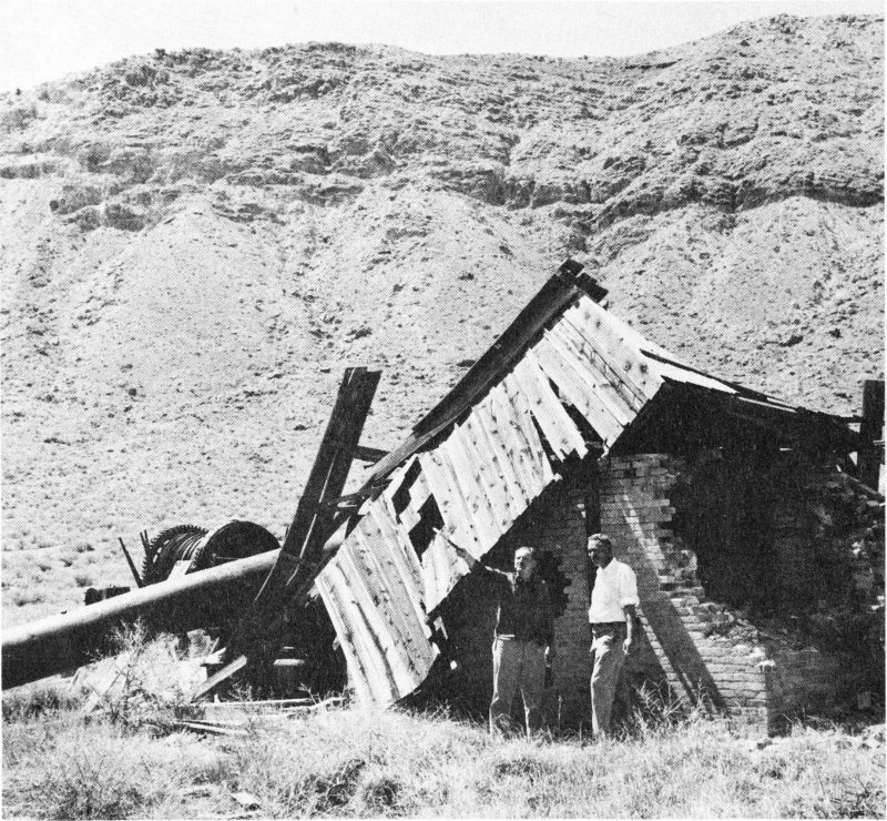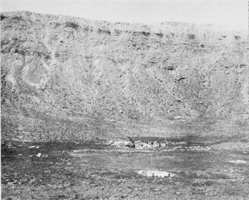 Collapsed mine buildings in the bottom of the Canyon Diablo meteorite crater. A shaft was put down here in one of several unsuccessful attempts to locate the main mass of the meteorite. See pp. 44-52.