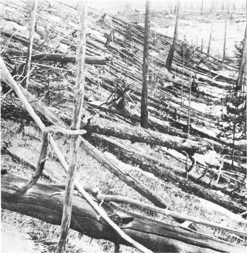 A scene of great desolation awaited them in the central region of the meteorite fall. Masses of crushed stone had been hurled hundreds of feet by the violent impact. Denuded, uprooted trees lay about—some cut in two as neatly as if by a saw. Large cedars had been splintered where they stood or had been torn up by the roots and thrown some scores of yards.