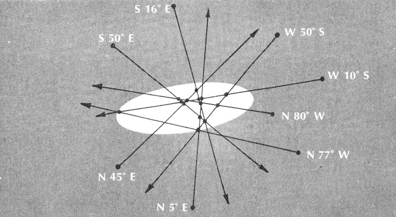 Typical distribution of meteorite fragments according to size, within oval-shaped area of fall. The larger masses of the shower carry farther on, in the direction of the motion of the meteorite. As early as 1814, investigators had noted this peculiarity of meteorite-shower distributions. See pp. 32, 89, 94.