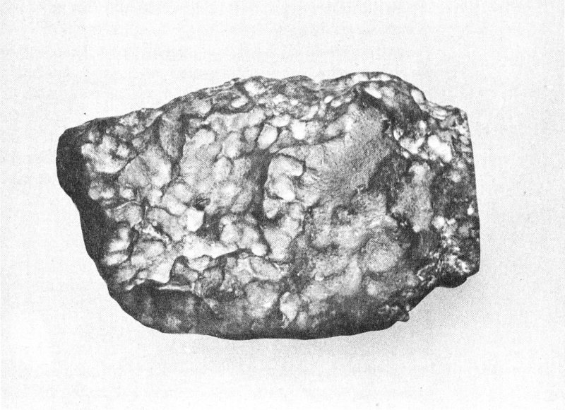 After the great meteorite had been raised out of the excavation, it was taken by truck to the University of New Mexico, in Albuquerque. There it was put on display beside the smaller 130-pound fragment found in May. By careful measurements, scientists determined the weight of the main mass to be approximately 2,360 pounds—a record weight for stony meteorites.[1] This remarkable meteorite, known as the Furnas County, Nebraska, stone, is now a prized item in the collection of the Institute of Meteoritics.