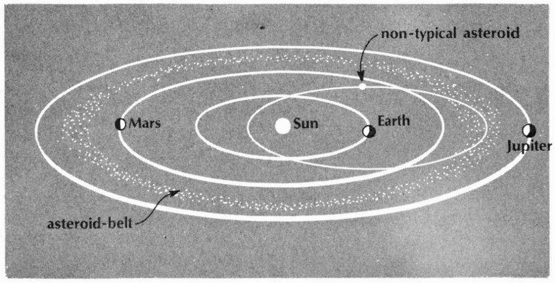 A diagram (not drawn to scale) showing position of asteroid-belt with respect to the orbits of Mars and Jupiter. The asteroids with average orbits move within this belt. The non-typical asteroid indicated follows an orbit that brings it well inside that of the earth. There are a number of asteroids with such peculiar orbits. It is possible that in the past a nickel-iron asteroid in one of these orbits collided with the earth and produced the Canyon Diablo meteorite crater.