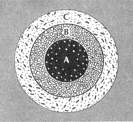 The stony meteorites came from C, the outer zone of silicate minerals in which relatively little or no nickel-iron is present. The chondrites were believed to come from the inner portion of this zone; the achondrites, from the outer portion.